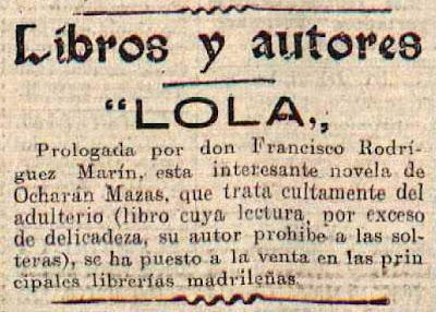 Más tarde escribirá otra novela, 'LOLA', que no estaba recomendada para las señoritas solteras por tratar del adulterio: