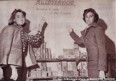 El recorrido que ahora iniciamos por los primeros autoservicios se ilustra con fotografías realizadas por F. Basabe y T. Naranjo para un reportaje de la revista Blanco y Negro (Archivo HUM). Participaron en él las actrices cinematográficas Luz Marquez y Mari Tere del Río. Simpáticas escenas del primer autoservicio de Madrid, hoy mal comparado con las tiendas de alimentación de "los chinos".